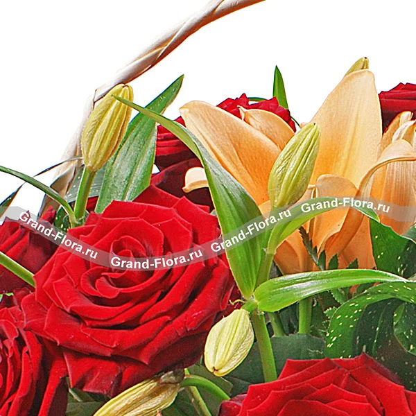 ДЕЛЮКС: роза красная - 25 шт., лилия желтая (по сезону. возможна замена на белую) - 4 шт., хризантема одноголовая зеленая - 7 шт., салал, папоротник - 8 шт., оазис, корзина.
