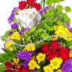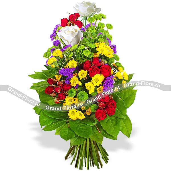 Уменьшенный: роза белая (70см) - 1 шт., роза красная кустовая - 3 шт., хризантема желтая ромашковидная - 3 шт., хризантема зеленая кустовая - 2 шт., статица - 2 шт., салал, сетка.