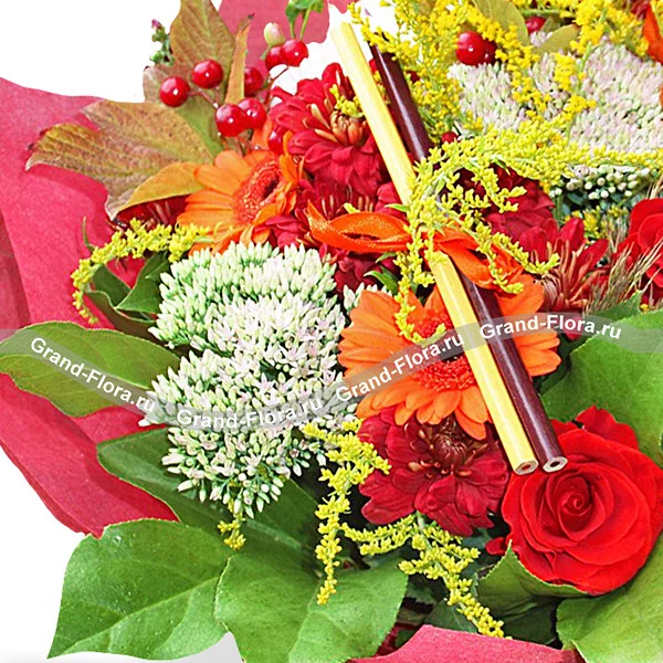 Стандартный: гербера оранжевая - 3 шт., роза красная (50 см) - 5 шт., хризантема одноголовая белая - 2 шт., очиток - 2 шт., фезалис - 1 шт., салал - 2 шт., солидаго - 2 шт., гиперикум - 1 шт., фетр бордовый, карандаши 4 шт., лента красная.