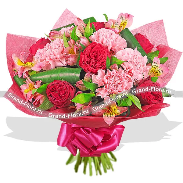 Роза красная - 15 шт, гвоздика розовая - 18 шт, альстромерия розовая - 14 шт, лист аспидистры загнутый - 9 шт, фетр красный.