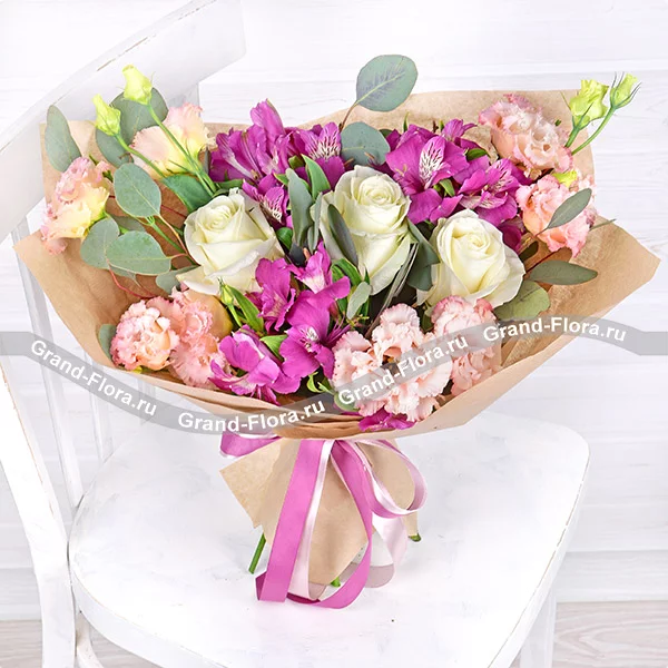 Роза белая- 5 шт., эустома розовая –  5 шт., альстромерия фиолетовая/розовая – 5 шт., декоративная зелень (эвкалипт) –  3 шт., упаковка, лента.