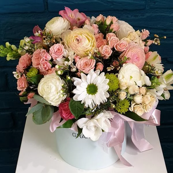Нам было необходимо срочно поздравить коллегу, которая улетела на свой день рождения в командировку. Она находилась в отеле и мы искали подходящий вариант подарка, чтобы ей было удобно его разместить в номере. Подумали, что стандартный букет может быть проблематичен ввиду того,что не найдётся вазы и нашей именинница будет вынуждена искать какую-то подходящую ёмкость. Остановили в итоге свой выбор на шляпной коробке с цветами. Флористы собрали красоту невероятнейшую! По нашему запросу предварительно прислали фото. Миллион благодарностей от нашей компании за то, что именинница осталась довольна! Обратимся к вам снова.